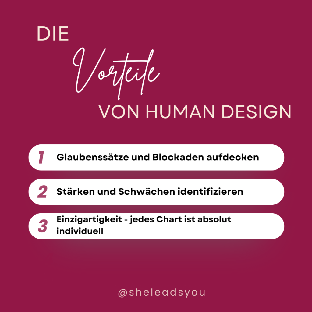 Human Design liefert Klarheit darüber, welche Faktoren uns beeinflussen und uns stärken oder blockieren können. Dies kann ich anhand deines Charts ablesen. Dieses besteht aus Zentren, Toren und Kanälen und ist absolut einzigartig. Hier sind die Hauptvorteile: